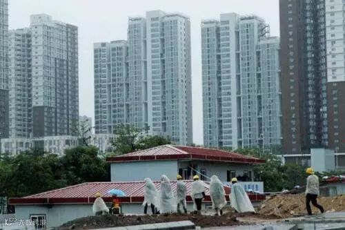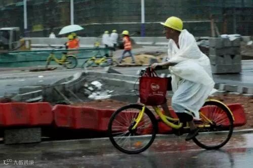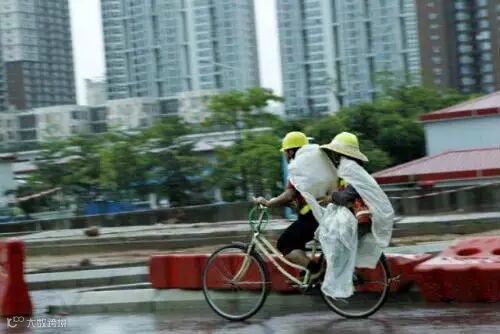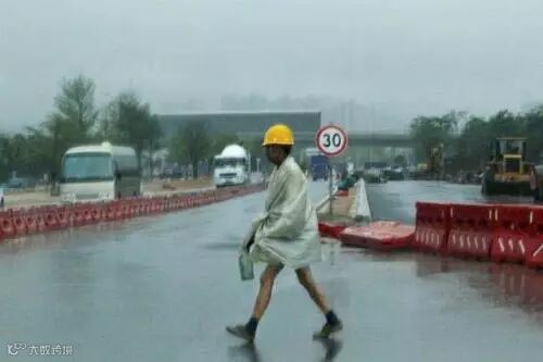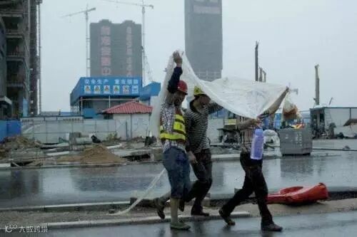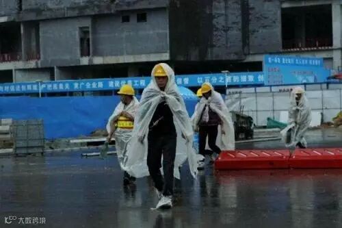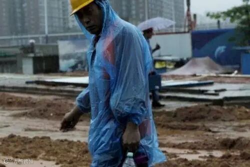 在身后笼罩在大雾中的高楼衬托下,这些身披自制简易雨衣的工人们就像是一个个跳动的音符,用自己的辛勤劳动,谱写着城市建设的辉煌乐章。