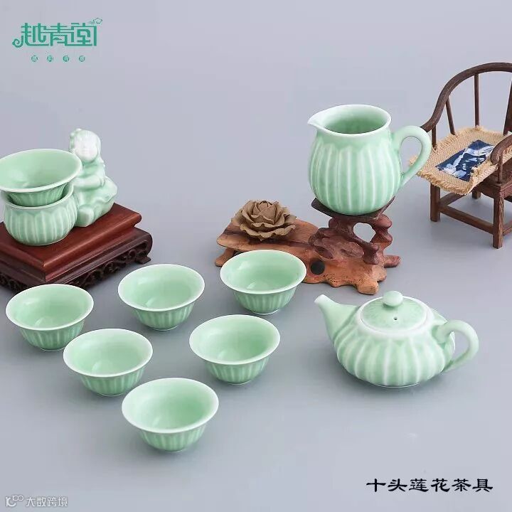 (十头莲花茶具:清丽雅致的款式,以莲花工艺装饰,犹如莲花般气质,清新和谐。)