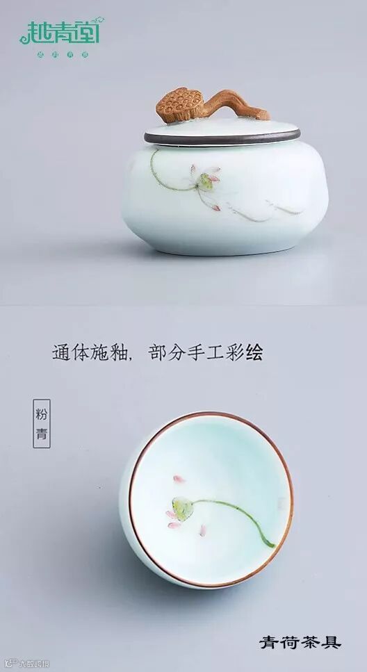 (青荷茶具:茶罐盖顶精致的莲藕,壶身杯体精细的手工彩绘,清新脱俗,雅致高洁,配以如冰似玉的釉色,吉祥美好。)