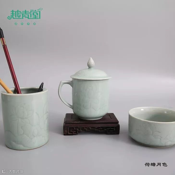 (荷塘月色:办公三件套,越窑工艺,如冰似玉,触手温润,精美荷花浮雕,给书房平添一丝清心之气。)