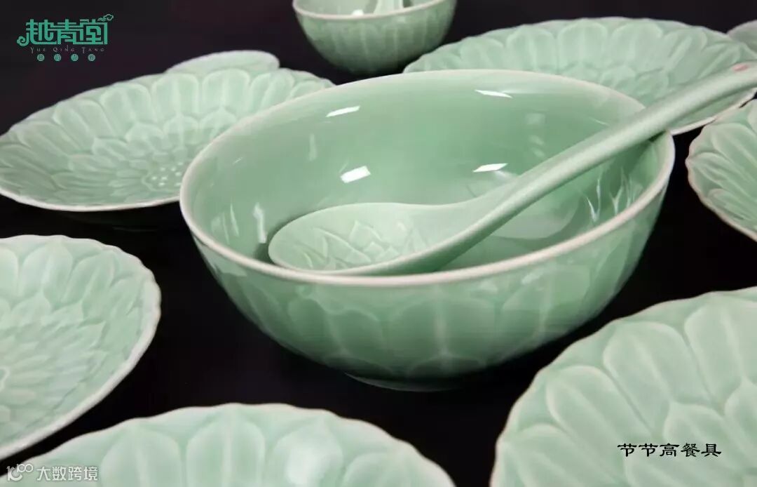(青莲餐具:盘、碗中间都以莲蓬为装饰,每件餐具外观都以莲花花瓣为饰,莲花圣洁、清净,莲蓬包含多个莲子,寓意“多子多孙,子孙满堂”。)