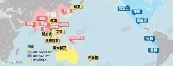 我们再来看看TPP和RCEP成员国示意图: