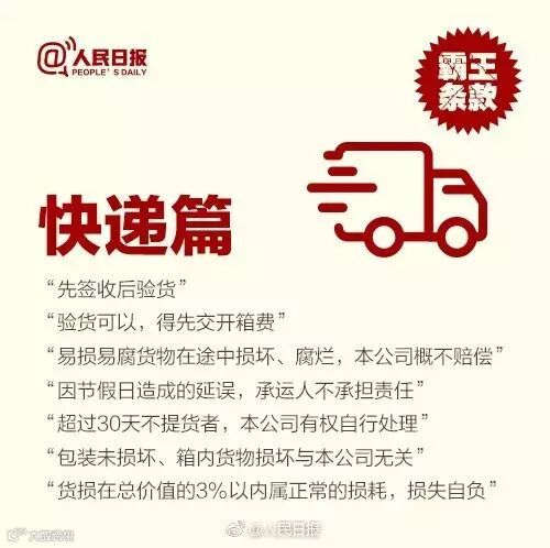 “先签收后验货”“KTV谢绝外带食物”“预付订金不予退还”“特价机票不支持退改签”“本单位保有最终解释权”……貌似约定俗成的规矩,其实都是霸王条款!如遇到,果断打12315投诉,为自己的权益扩散!