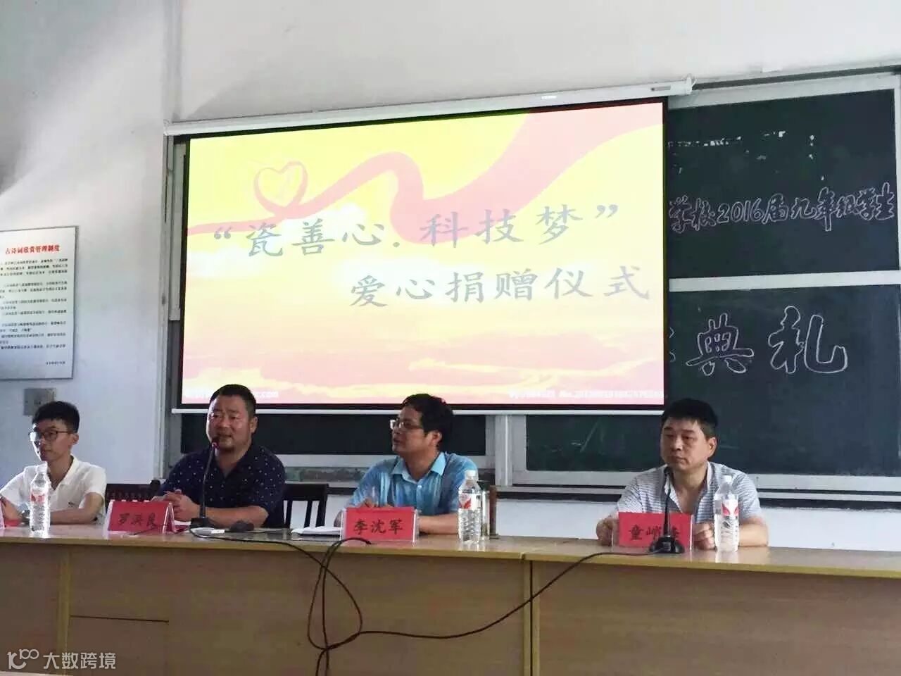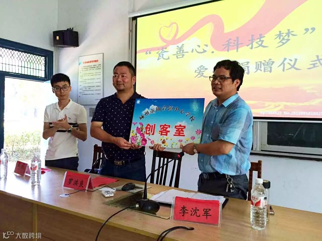 越青堂罗总为仙岩镇中心学校授牌,希望仙岩镇中心学校能够成为一所科学示范学校。