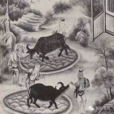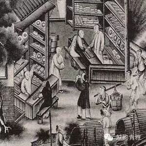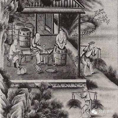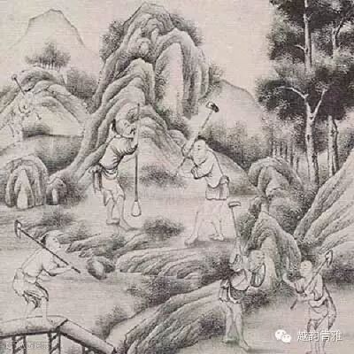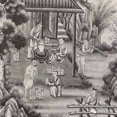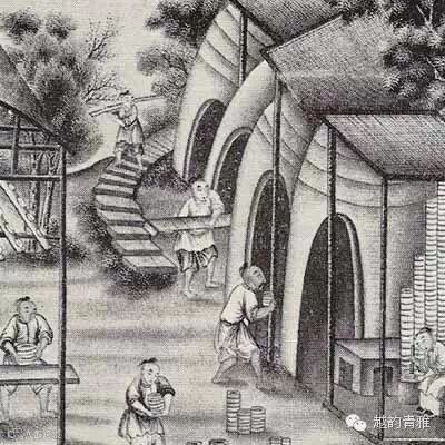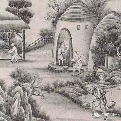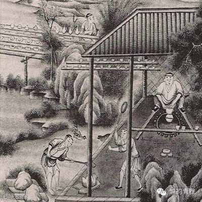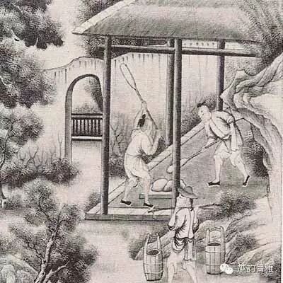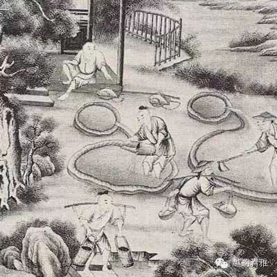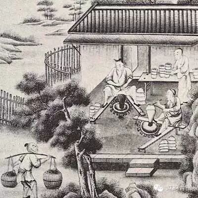 图中淘洗具体作法是依山就势,利用斜坡,从高而下建三、四个池子(多至五、六个),将细碎瓷料倒入池子化成泥浆,水浆经不同池子顺势流向低池子中,粗大的瓷料先沉淀,最细的瓷料沉淀在最低的池子内,蒸发水分后成泥块状,也就是制瓷坯泥。多次揉和后即可用来制作瓷坯了。