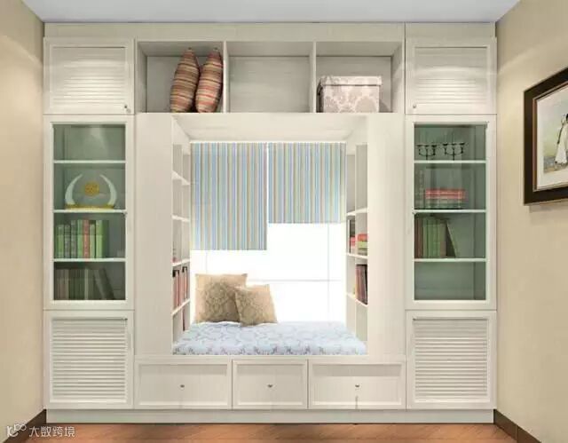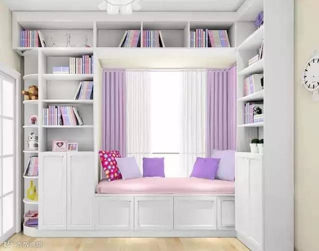 飘窗处量身打造一个“回”型整体储物柜,不仅化身阅读区,还能收纳超级多的物品。