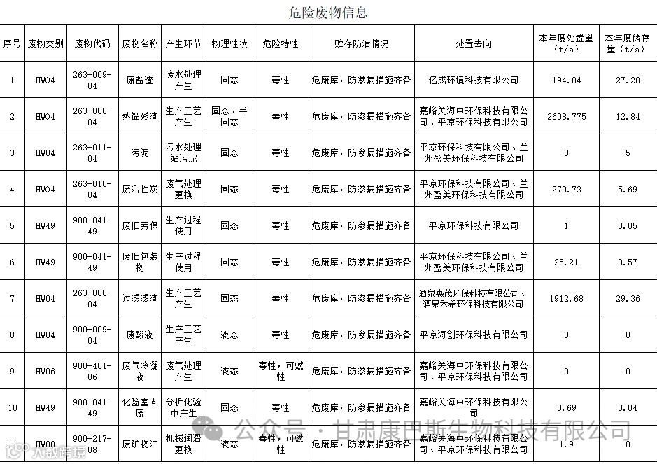 按照《中华人民共和国固体废物污染环境防治法》及相关管理规定、条例要求,现将甘肃康巴斯生物科技有限公司(以下简称本公司)2023年度危险废物污染防治信息通过网站形式进行公示。