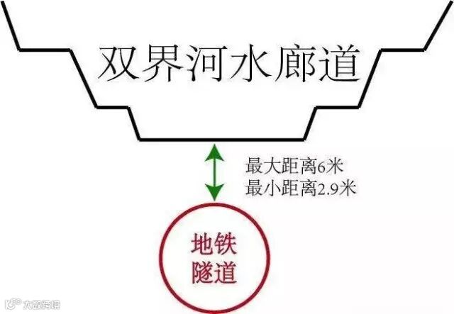 双界河水廊道项目范围内涉及到4条地铁运营线路的保护,其中有3条线路(地铁5号线、1号线和车辆段左出入线)横穿河底(上图绿色虚线),1条线路(车辆段右出入线)平行河道,位于左岸岸坡下(上图黑色粗线)。4条地铁线路距河底(或坡面)的埋深最小仅为2.9米,最大不过6米。