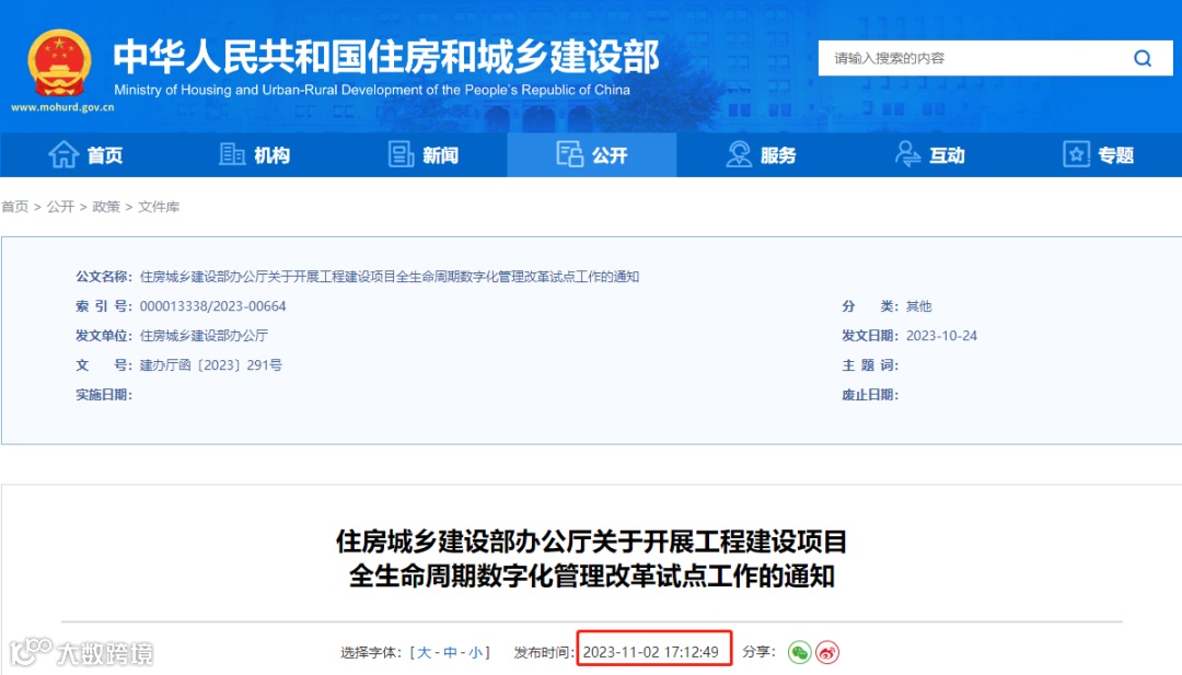 11月2日,住建部发布《关于开展工程建设项目全生命周期数字化管理改革试点工作的通知》(建办厅函〔2023〕291号)。决定在天津等27个地区开展工程建设项目全生命周期数字化管理改革试点工作。