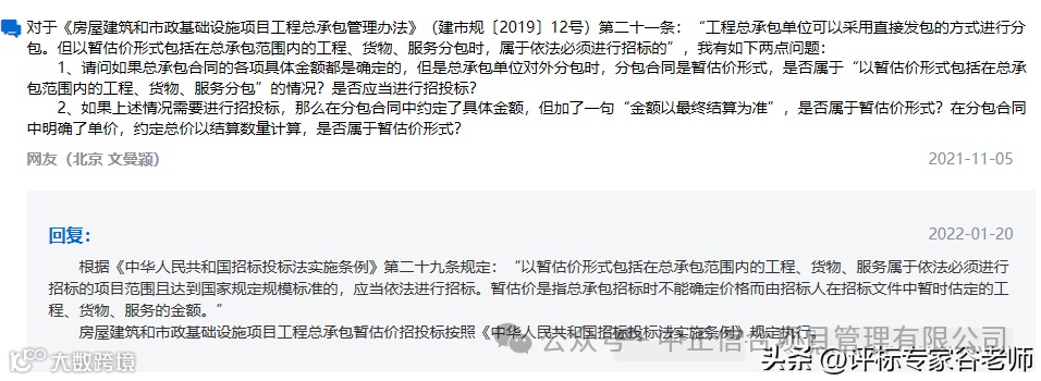 北京网友提问:对于《房屋建筑和市政基础设施项目工程总承包管理办法》(建市规〔2019〕12号)第二十一条:“工程总承包单位可以采用直接发包的方式进行分包。但以暂估价形式包括在总承包范围内的工程、货物、服务分包时,属于依法必须进行招标的”,我有如下两点问题:1、请问如果总承包合同的各项具体金额都是确定的,但是总承包单位对外分包时,分包合同是暂估价形式,是否属于“以暂估价形式包括在总承包范围内的工程、货物、服务分包”的情况?是否应当进行招投标?2、如果上述情况需要进行招投标,那么在分包合同中约定了具体金额,但加了一句“金额以最终结算为准”,是否属于暂估价形式?在分包合同中明确了单价,约定总价以结算数量计算,是否属于暂估价形式?