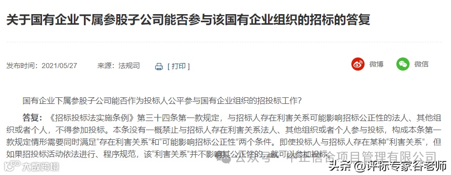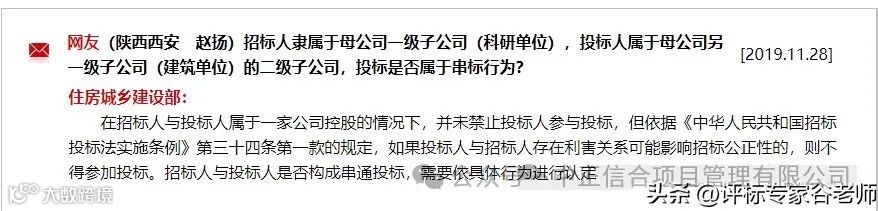 四、同一母(总)公司的多家全资控股或绝对控股子公司,各子公司的单位负责人不是同一人,他们之间也不存在直接控股或管理关系的。这样的情况下,各子公司同时参与同一合同下的政府采购活动是否违反现行的法规要求?答:根据政府采购法实施条例第十八条规定,如果参与投标的子公司间不存在相互控股、管理关系或者负责人为同一人的,则不违反规定。(答复单位:财政部国库司)发改委回应:必须招标工程项目范围这样界定国家发改委在其官方网站对有关必须招标工程范围和招标投标行业中的疑难问题进行了集中答复和回复。我们整理了全文,供相关从业者参考。文末附相关文件全文~ 国家发展改革委 回复留言选登汇总Q1