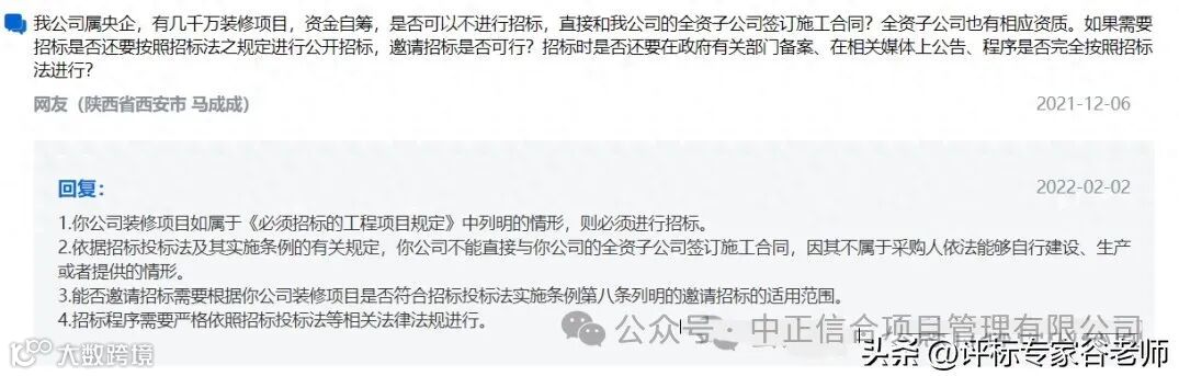 以下为答复全文——陕西网友提问:我公司属央企,有几千万装修项目,资金自筹,是否可以不进行招标,直接和我公司的全资子公司签订施工合同?全资子公司也有相应资质。如果需要招标是否还要按照招标法之规定进行公开招标,邀请招标是否可行?招标时是否还要在政府有关部门备案、在相关媒体上公告、程序是否完全按照招标法进行?