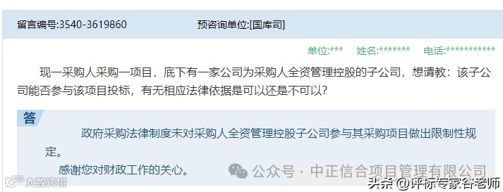 三、现一采购人采购一项目,底下有一家公司为采购人全资管理控股的子公司,想请教:该子公司能否参与该项目投标,有无相应法律依据是可以还是不可以?答:政府采购法律制度未对采购人全资管理控股子公司参与其采购项目做出限制性规定。(答复单位:财政部国库司)