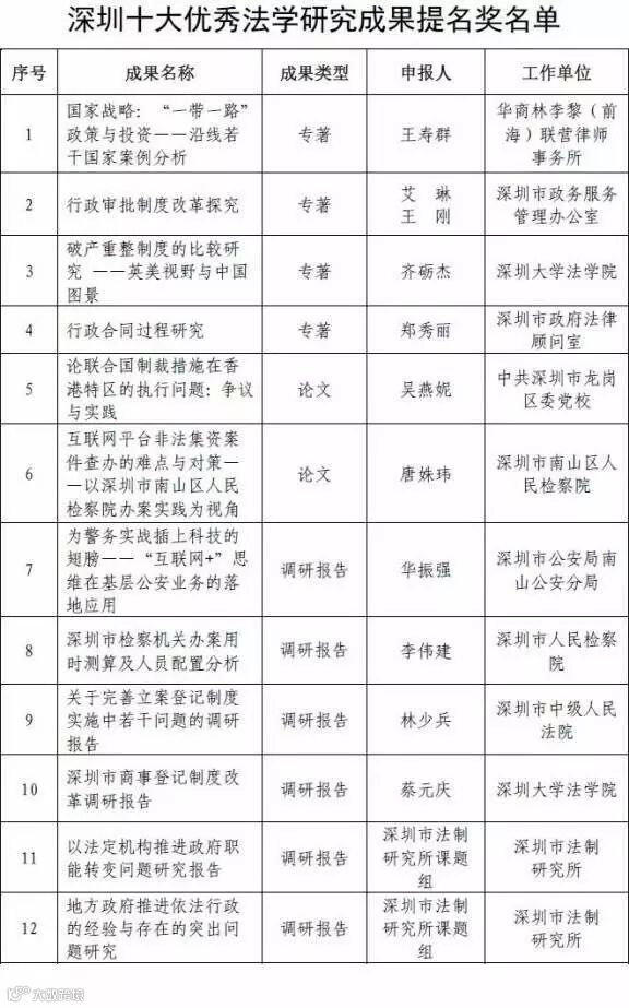2016年10月-12月,深圳市法学会启动了首届“深圳十大优秀法学研究成果”评选活动。评选活动共收到相关部门和个人申报的近百份法学成果,涵盖立法、法治政府、司法、法治社会等领域,最终产生了首届“深圳十大优秀法学研究成果”及“提名奖成果”。