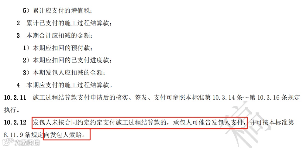 10.2.12 发包人未按合同约定约定支付施工过程结算款的,承包人可催告发包人支付,并可按本标准第 8.11.9 条规定向发包人索赔。