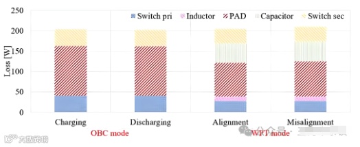 根据损耗计算、JMAG仿真和实验结果,图8显示了所提出的充电系统在3.3kW额定输出功率下的损耗分布情况: