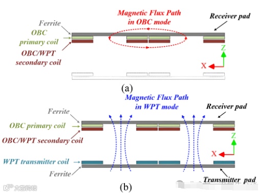 图3、(a) OBC模式与(b) WPT模式下的磁通路径示意图