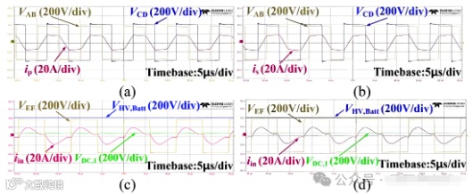 图6、系统在3.3kW输出功率下的实验波形:(a) OBC充电模式 (b) OBC放电模式 (c) WPT对正状态 (d) WPT错位状态