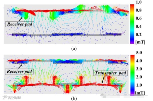 图5、磁垫在(a)OBC和(b)WPT模式下的磁通密度矢量图(基于JMAG仿真)。
