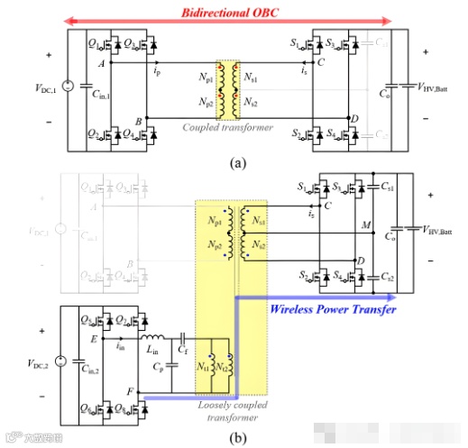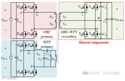 有方案提出通过复用发射侧逆变器与谐振网络来提高功率密度,但仍需保留车载充电器(OBC)和车载接收系统。有方案提出通过增加WPT接收线圈,不仅共享了整流器,还实现了接收侧谐振电容的复用,来提高了系统功率密度。有方案提出将电感器与磁耦合线圈集成,有效降低系统成本与体积。有共享开关器件和磁耦合线圈的WPT-辅助电源集成模块等。