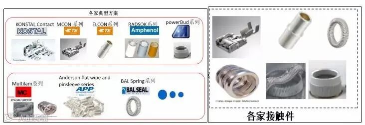 从早期的公母端直接接触过渡到了中间有弹性导体接触材料的方式 ,中间采用弹性导体的接触方式更适合较大电流的连接,其