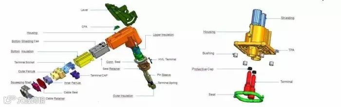 基本上由:机壳(公端、母端)、端子(公母端子)、屏蔽罩、密封(尾部、半端、线端、接触)尾部防护盖、高压互锁系统、CPA系统等结构组成。