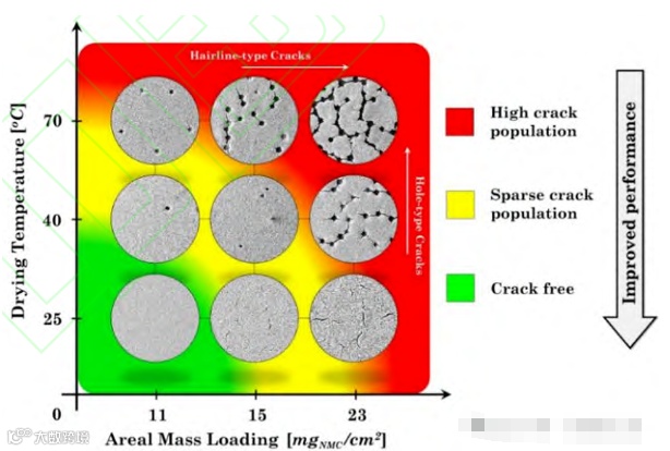 总之,干燥过程中产生的裂纹主要是由毛细压力引起的。关键因素可以归纳为两个层面:一是涂层的内在特性,涉及涂层材料的选取和涂层厚度的选择;二是涂层的边界条件,包括集流体材料的选择以及由干燥环境的温度和湿度共同决定的溶剂蒸发速率。在极片裂纹控制方面,除了材料选择外,优化涂层面密度载荷和干燥条件也是关键。