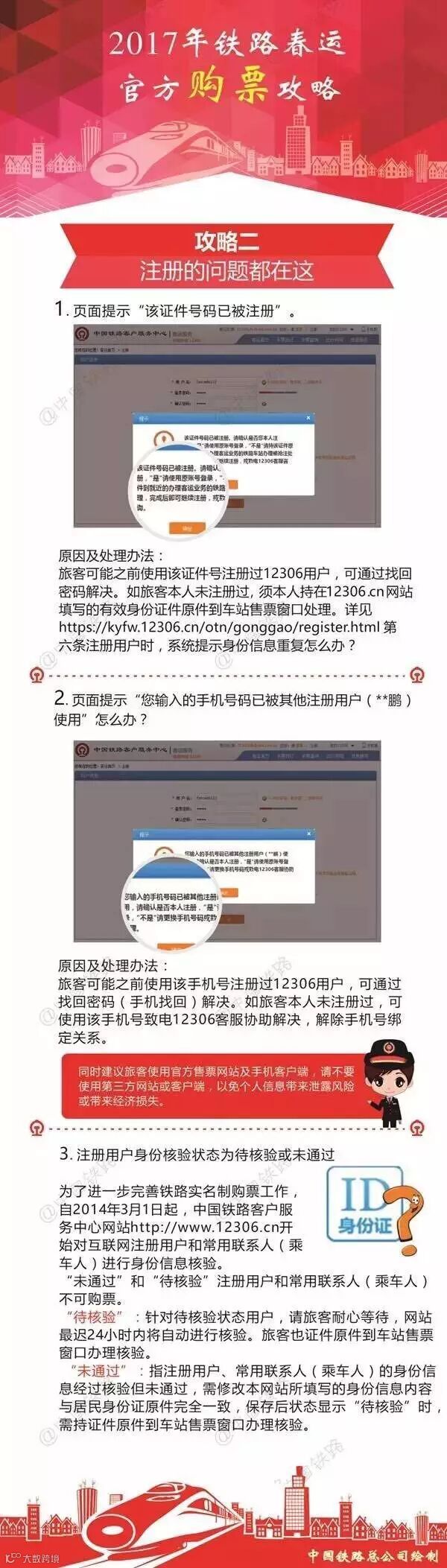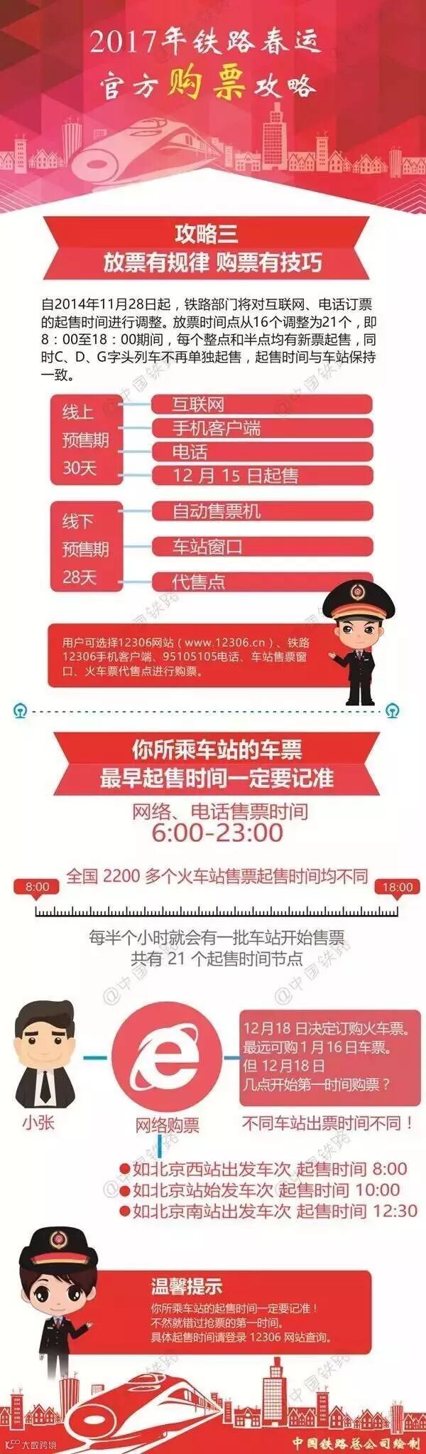 购票攻略来啦!12月15日,通过网络和电话可以购买2017年1月13日,也就是2017年春运第一天的火车票了。要买票的童鞋不要急不要慌也不要紧张,中国铁路为大家准备了2017年铁路春运官方购票攻略,注册、购票、捡漏、取票,你想知道的东西都在这,带着你回家的信仰一起攻略吧!