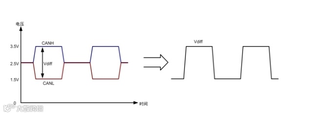 当CAN总线运用双绞线的时候就可以很好的解决这些干扰问题,CAN接口采用的是差分信号传输方式。差分信号传输是一种使用两个互补电信号进行信息传递的方法。以高速CAN为例,不同的逻辑状态通过CANH、CANL两根信号线进行传输,接收电路只对两根信号线的信号差值进行识别。理想状态下,CAN总线的波形如下图所示: