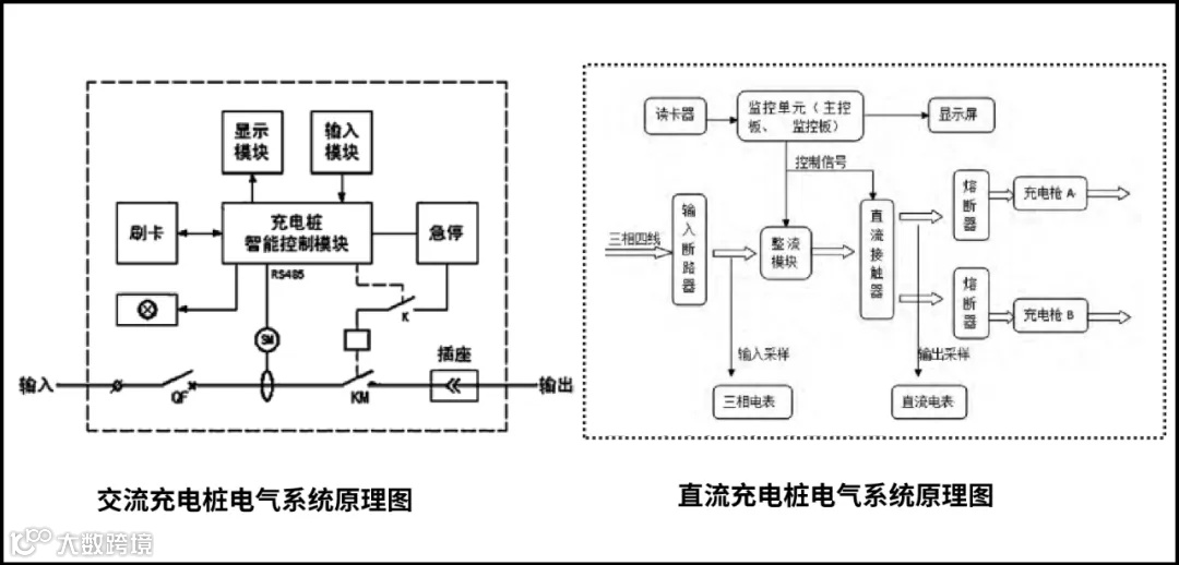 直流充电桩:直流充电桩直接接入电网,可直接为电动车的电池充电,一般采用三相四线制或三相三线制供电,输出的电压和电流可调范围大,可以实现电动车快速充电。
