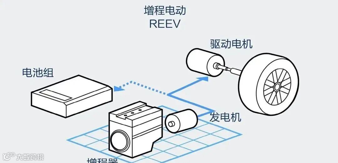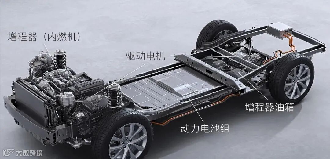 增程式混动采用最简单的串联技术架构,由增程器、电池、电动机串联而成,电机负责驱动车辆行驶,增程器其实就是一个小排量的发动机,仅仅只是用来发电。在传递路线上是一种串联的能量转换和动力传递关系