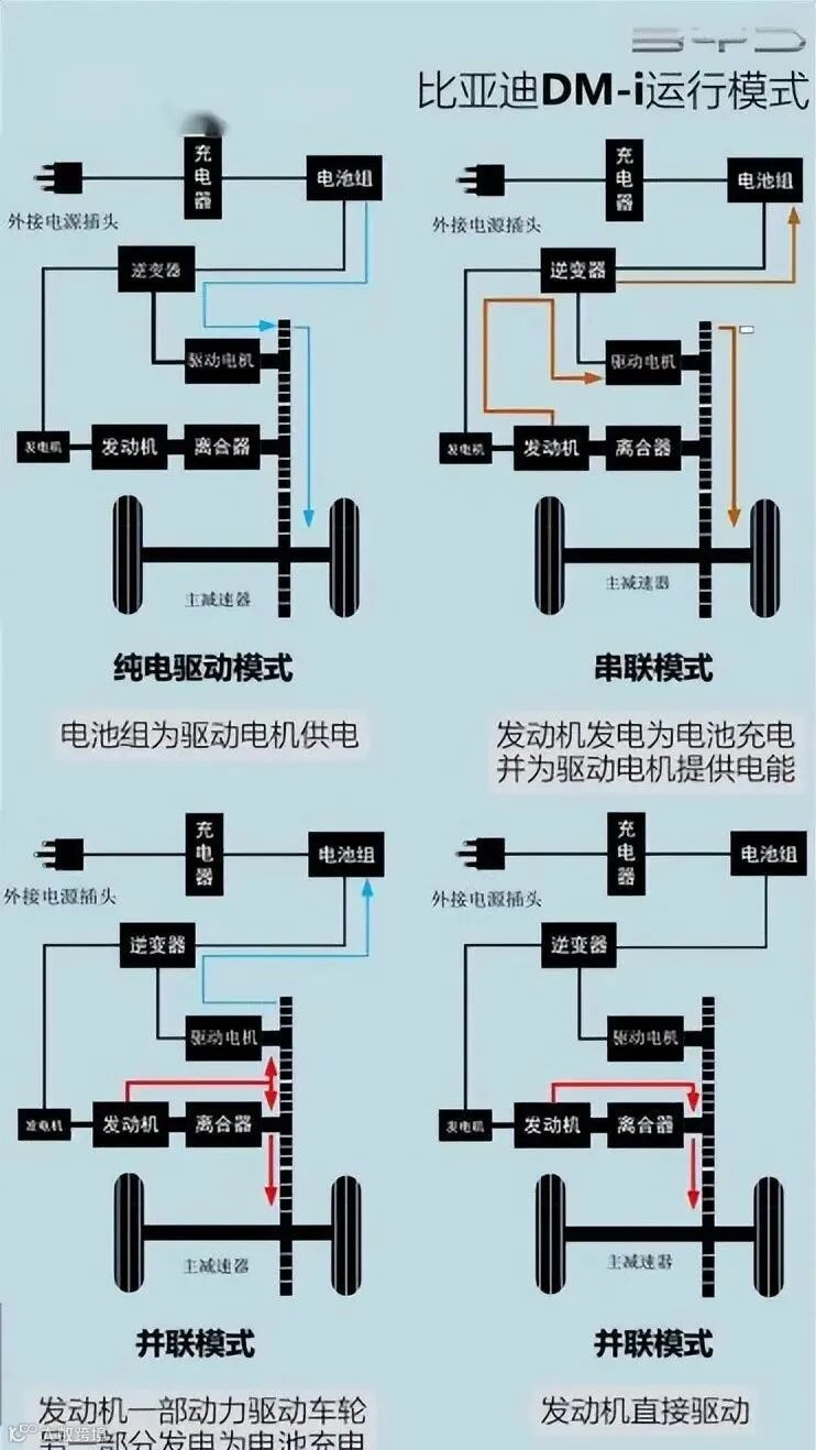而以比亚迪为代表的插混车型,与增程式最大的区别就是混动模式的多样性,插混系统可以支持串联、并联、发动机直驱等多种工作模式