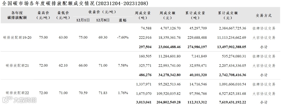 截至本周,全国碳市场碳排放配额累计成交量427,400,829吨,累计成交额23,860,041,996.63元。
