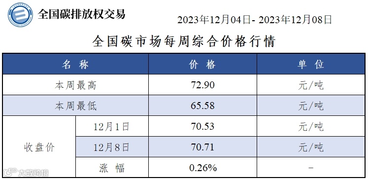 本周全国碳市场综合价格行情为:最高价72.90元/吨,最低价65.58元/吨,收盘价较上周五上涨0.26%。