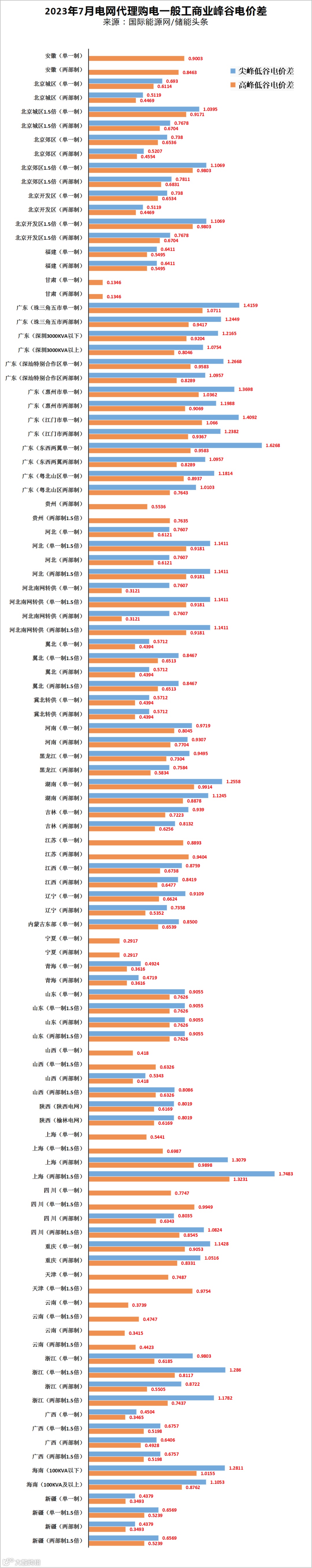 7月电网代购电价格中,全国峰谷价最高的是上海市,执行两部制1.5倍尖峰电价时,峰谷价差为1.8923元/kWh。峰谷电价差超过0.7元以上的地区达到了22个区域。
