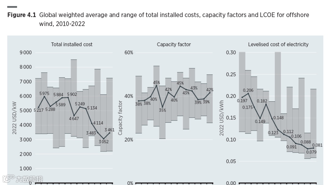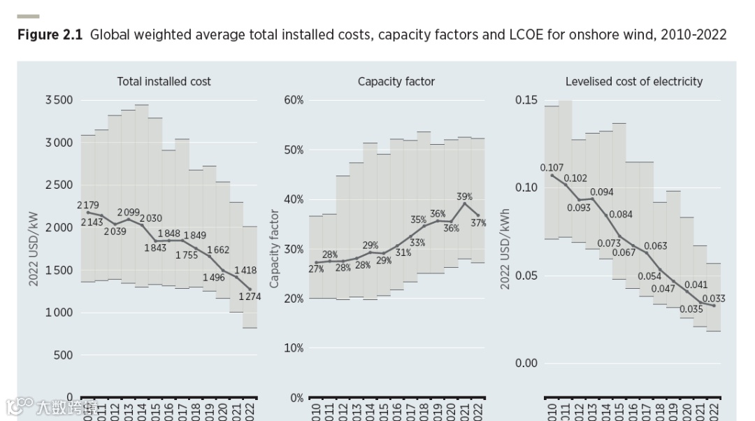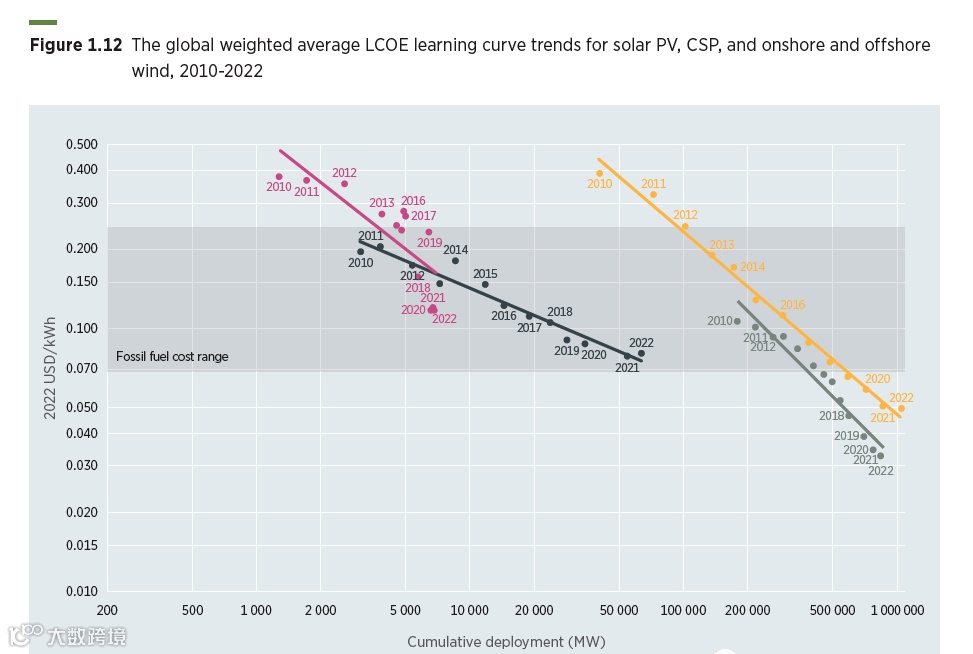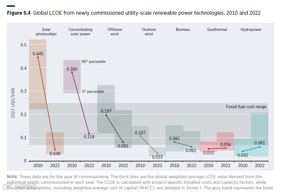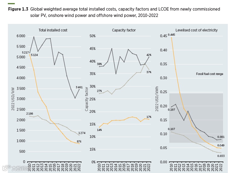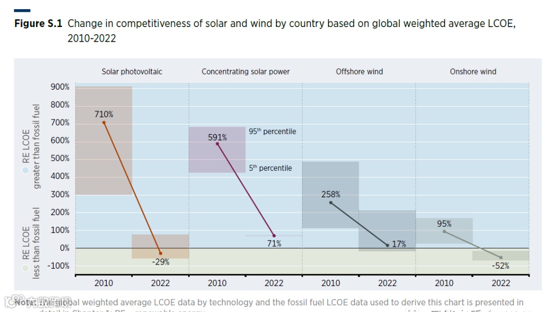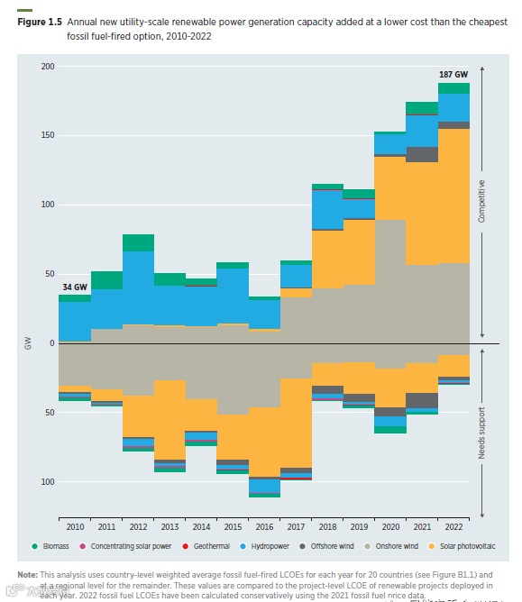 在2010到2022年间,即使没有财政的支持,太阳能和风能也比化石燃料更具成本竞争力。