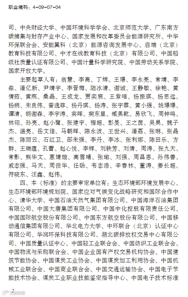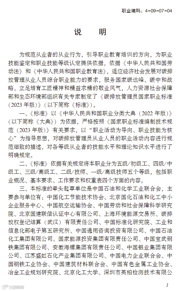 这份文件,是开展碳排放管理员职业技能建设工作的基础文件,对相关从业人员的职业活动内容进行描述,给出了各等级的技能水平和理论知识水平进行了明确规定。