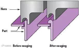 本方法与铆焊法类似,将凹状的焊头压着于塑胶品外圈,焊头发出超音波超高频振动后将塑胶溶融成形而包覆于金属物件使其固定,且外观光滑美观、此方法多使用在电子类、喇叭之固定成形,及化妆品类之镜片固定等。