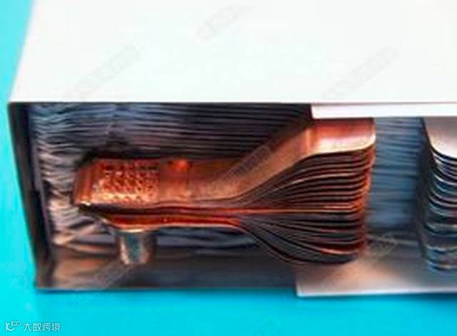 在锂电池技术中,涉及到的金属焊接方式有三种:铜/铝箔对极耳(foil to tab),极耳对极耳(tab to tab),极耳到母排(tab to bus)。其中,铜/铝箔焊接到极耳上,难度最大。因为金属焊接的两端采用不同厚度和材料的金属,一端(tab)相对较厚(例如0.2mm),另一端由多层极薄的金属片构成。下图展示了一个锂离子电池单元的剖面图。