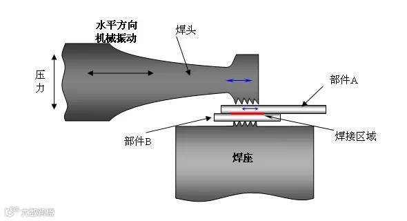 超声波焊接是利用高频振动波传递到两个需焊接的物体表面,在加压的情况下,使两个物体表面相互摩擦而形成分子层之间的熔合。