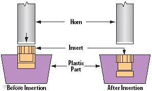 借着焊头之传道及适当之压力,瞬间将金属零件(如螺母、螺杆等)挤入预留入塑胶孔内,固定在一定深度,完成后无论拉力、扭力均可媲美传统模具内成型之强度,可免除射出模受损及射出缓慢之缺点。
