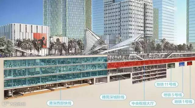地下4层是两条城际轨道线:港深西部快轨和“穗莞深”城际轨道线。港深西部快轨建成后,从前海出发15分钟可达