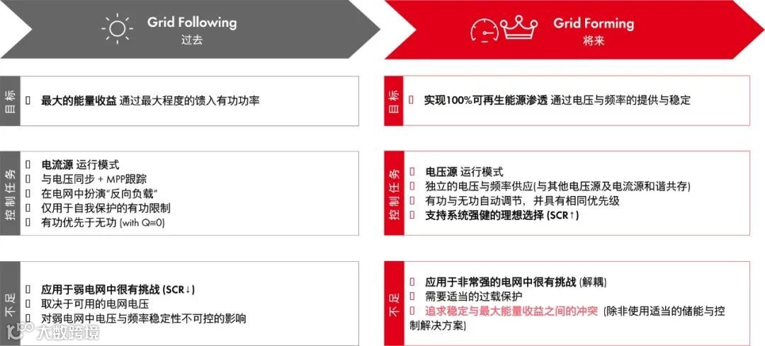 下图是Grid Following和Grid Forming的对比。在左图中,Grid Following跟网型储能逆变器输出的能量和电网所产生的信号没有交集,电网仅仅提供参考电压。一旦光伏电站进行工作,组件就会向电网注入恒定的有功功率。