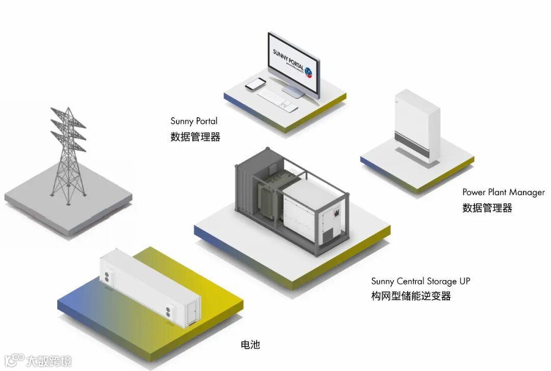 SMA构网型储能系统主要由电池、Sunny Central Storage UP储能变流器及数据管理器组成。