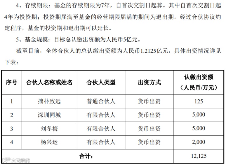 基金的目标规模为人民币5亿元,其中顺丰附属公司深圳同城拟出资5000万元或基金总认缴出资额的45%(以较低者为准)。截至目前,合伙人总出资额为1.2125亿元,其中顺丰参与出资5000万元。