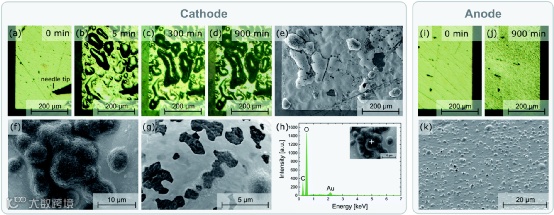 图3 实验前(a)、实验中(b和c)和实验后(d)的负极化Au电极(3V,400℃设定温度)的光学显微镜图像。沉积的固体(很可能是Li2CO3)的SEM图像(e-g)和EDX光谱(h)。实验前(i)和实验后(j和k)相应的正极化电极的光学显微镜和SEM图像,表明电极下面有气体(O2)形成。