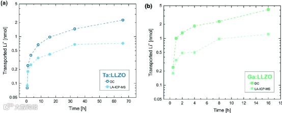 图9 在电极极化过程中(2V电压,350℃设定温度,100μm电极直径)通过LA-ICP-MS以及直流测量确定的锂离子总量,对于(a)Ta:LLZO(0.5-66小时)和(b)Ga:LLZO(0.5-16小时极化时间)单晶。从电流曲线得到的数值一般较高,但即使是最长的极化实验,也是在同一数量级,证实大部分极化电流是由LLZO分解引起的。