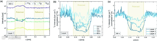 图8 Ta:LLZO单晶在恒定电压实验后的LA-ICP-MS分析(2V电压,0.5-66小时极化时间,350℃设定温度,100μm电极直径)。(a)对应于极化(66小时)以及未处理电极的原始信号强度。(b)不同的极化时间和(c)随后的烧蚀次数的归一化锂信号。电极下方明显的锂损耗是由施加的场应力引起的,甚至在极化数天后变得更加明显。