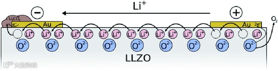 图5 通过条纹电极由LLZO极化引起的过程示意图。由于在CO2和H2O的存在下,空气中的O2被还原,含锂盐如Li2CO3在阴极沉积。在阳极上,由于氧化离子的氧化而形成O2,导致LLZO的O2-和Li+和/或Li-poor相的亚比例量。在反应过程中,锂离子不断地从阳极传输到阴极。
