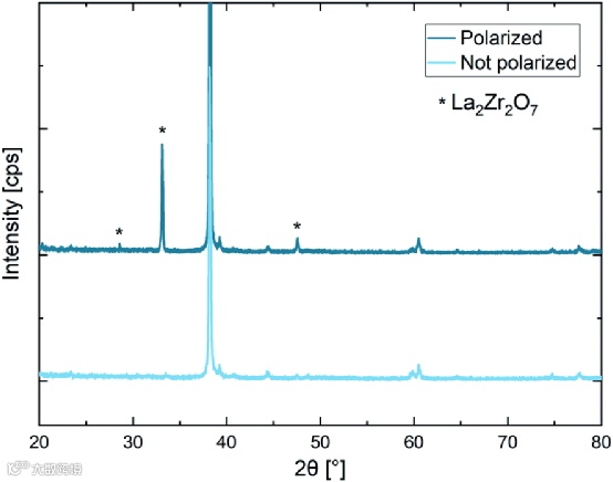 图10 恒定电压极化实验(2V电压,120小时极化时间,350℃设定温度,400μm电极直径)后的微聚焦XRD测量。由于施加电场应力,形成了La2Zr2O7。